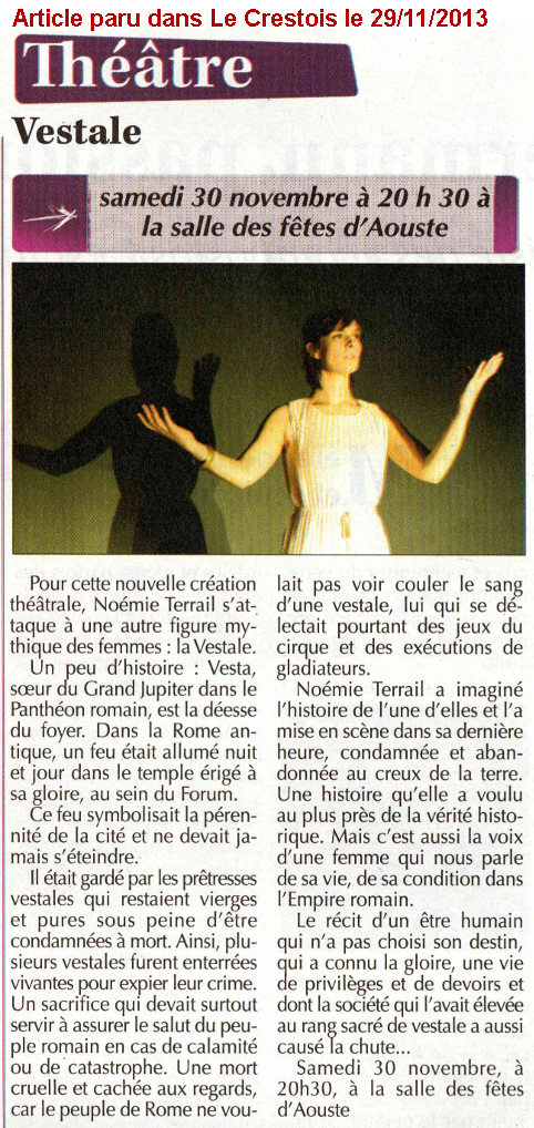 Car son sacrifice est au service de la vie politique et du pouvoir en place, tel le poète qu’on veut faire taire en l’exilant aux confins de l’Empire, la condamnation de la Vestale sert d’exemple et rappelle que chacun doit rester à sa place. Du fond de sa fosse, comme le poète du fond des âges à travers les manuscrits qui ont survécu, cette femme délivre sa parole pour ceux qui sont prêts à l’écouter. Elle nous rappelle combien la liberté est précieuse, à défendre et à savourer.